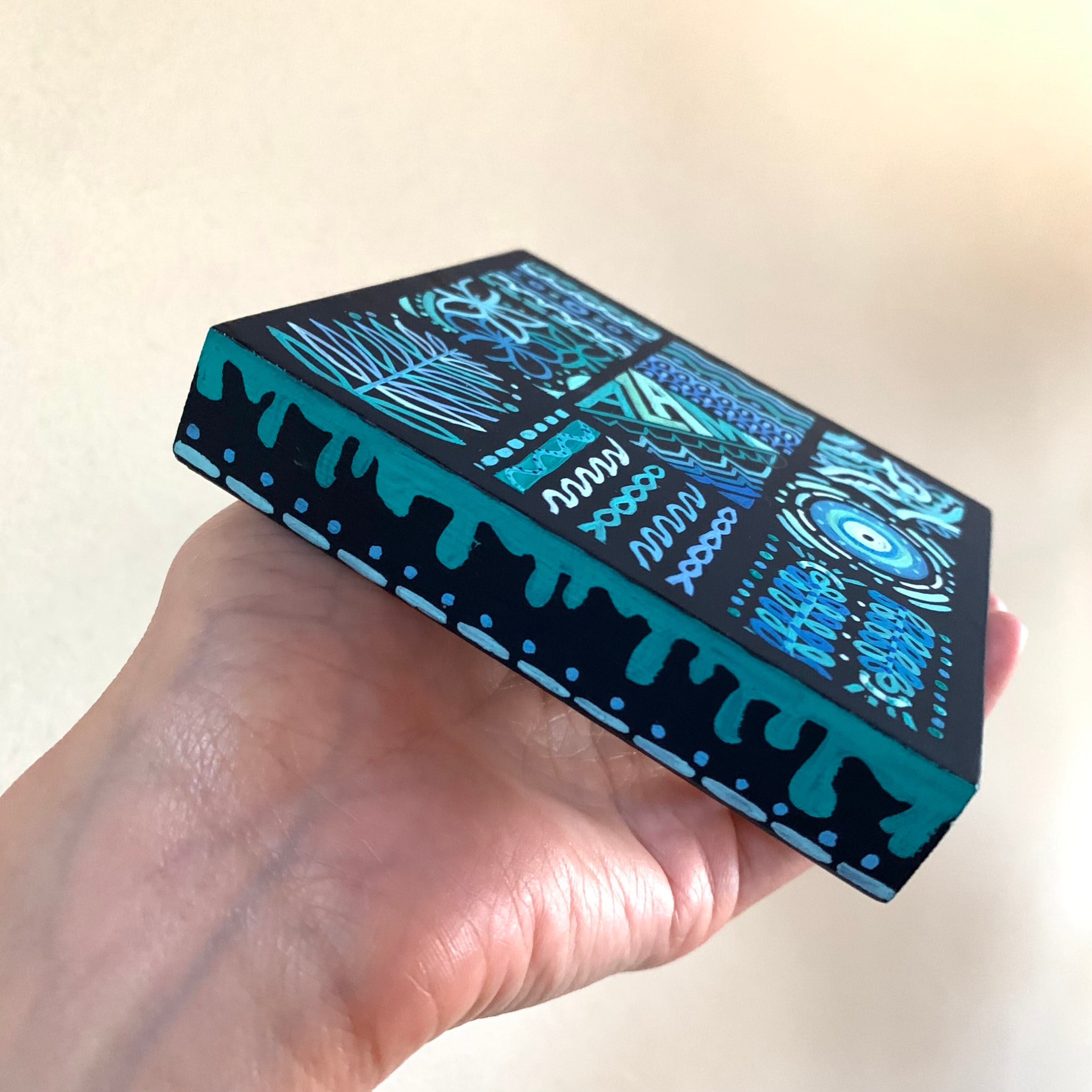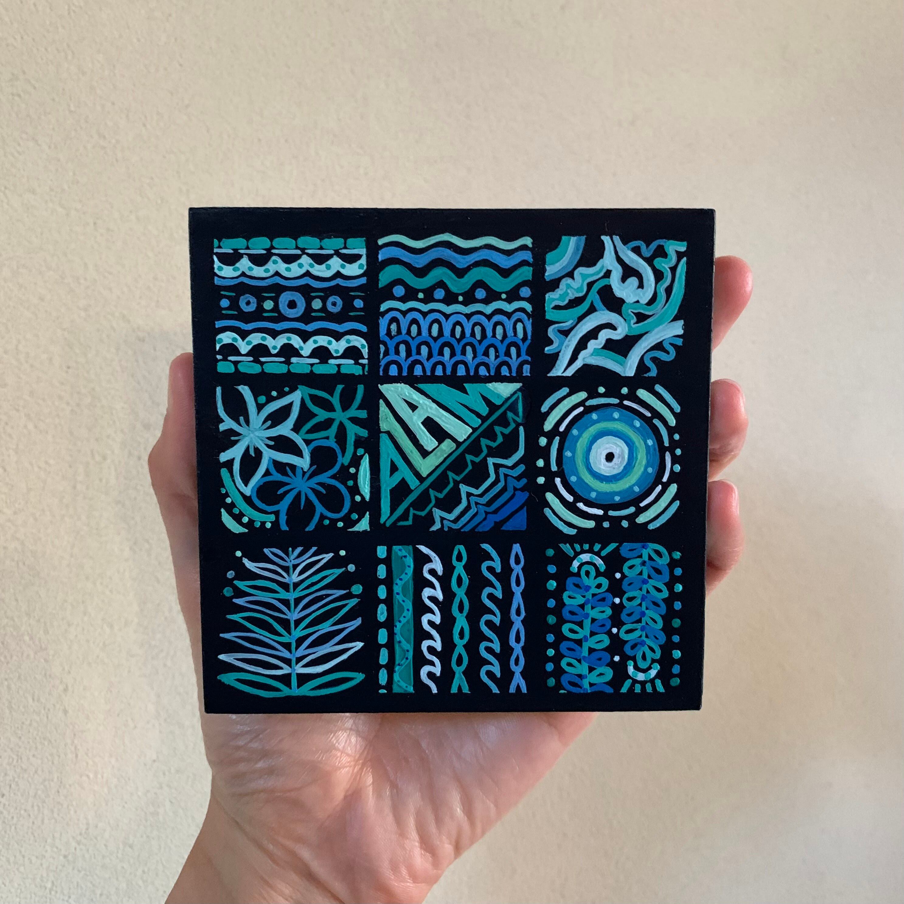 南国の植物や幾何学模様を融合させた柄を10センチ四方の木製ボードに描きました