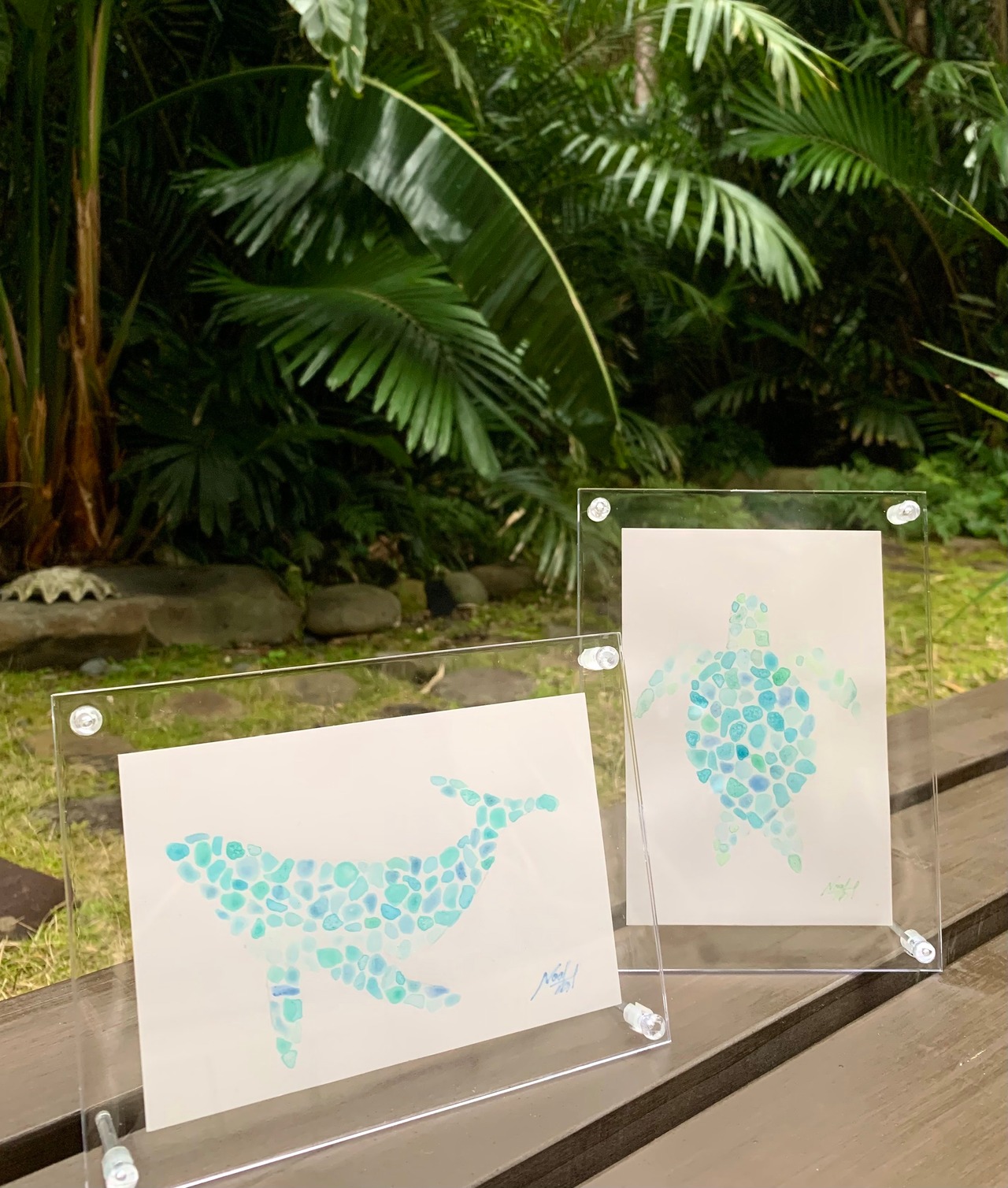 はがきサイズのカードにシーグラスを並べたようなクジラを描きました。アクリル絵の具を使って水彩画風に仕上げています。