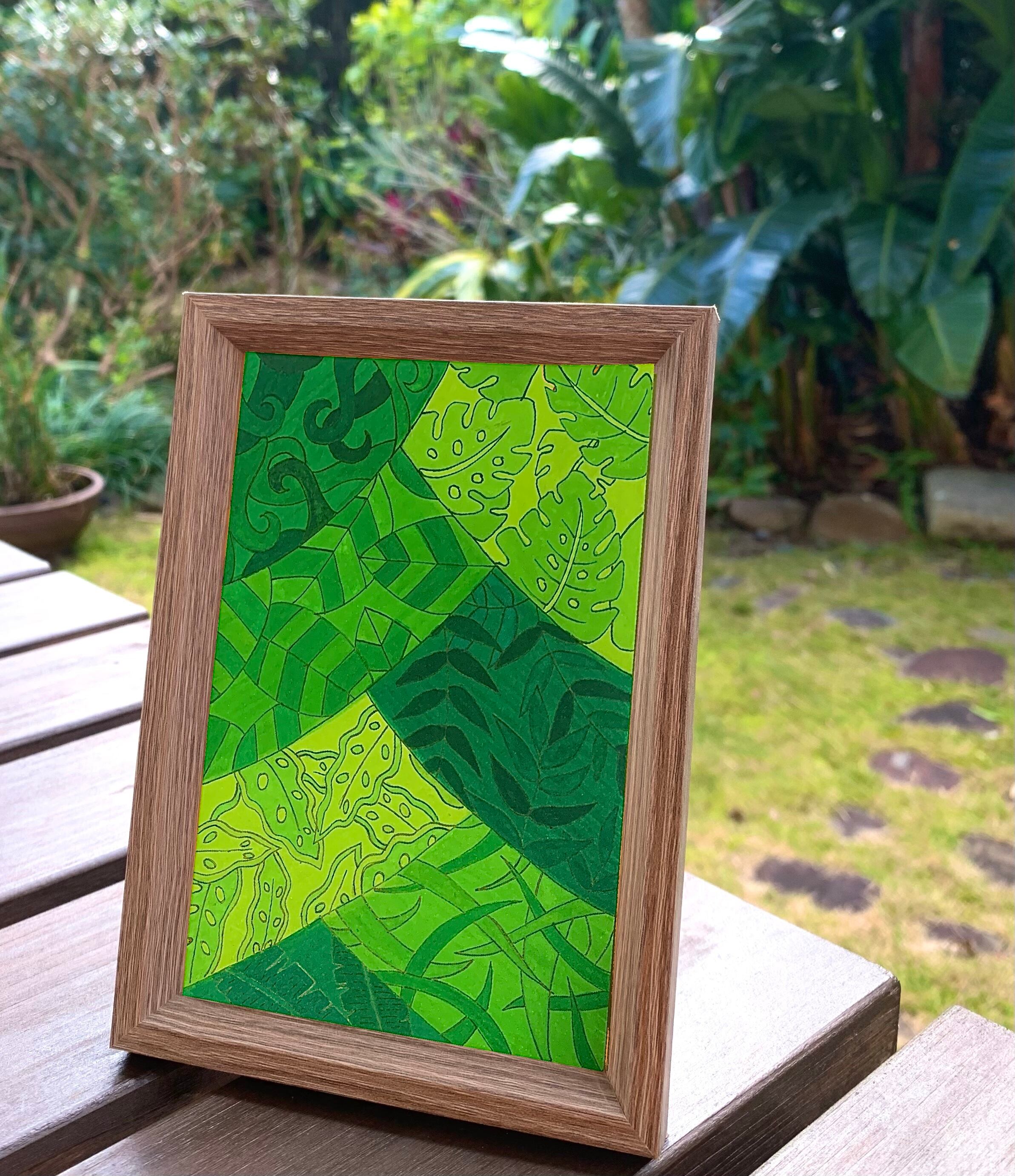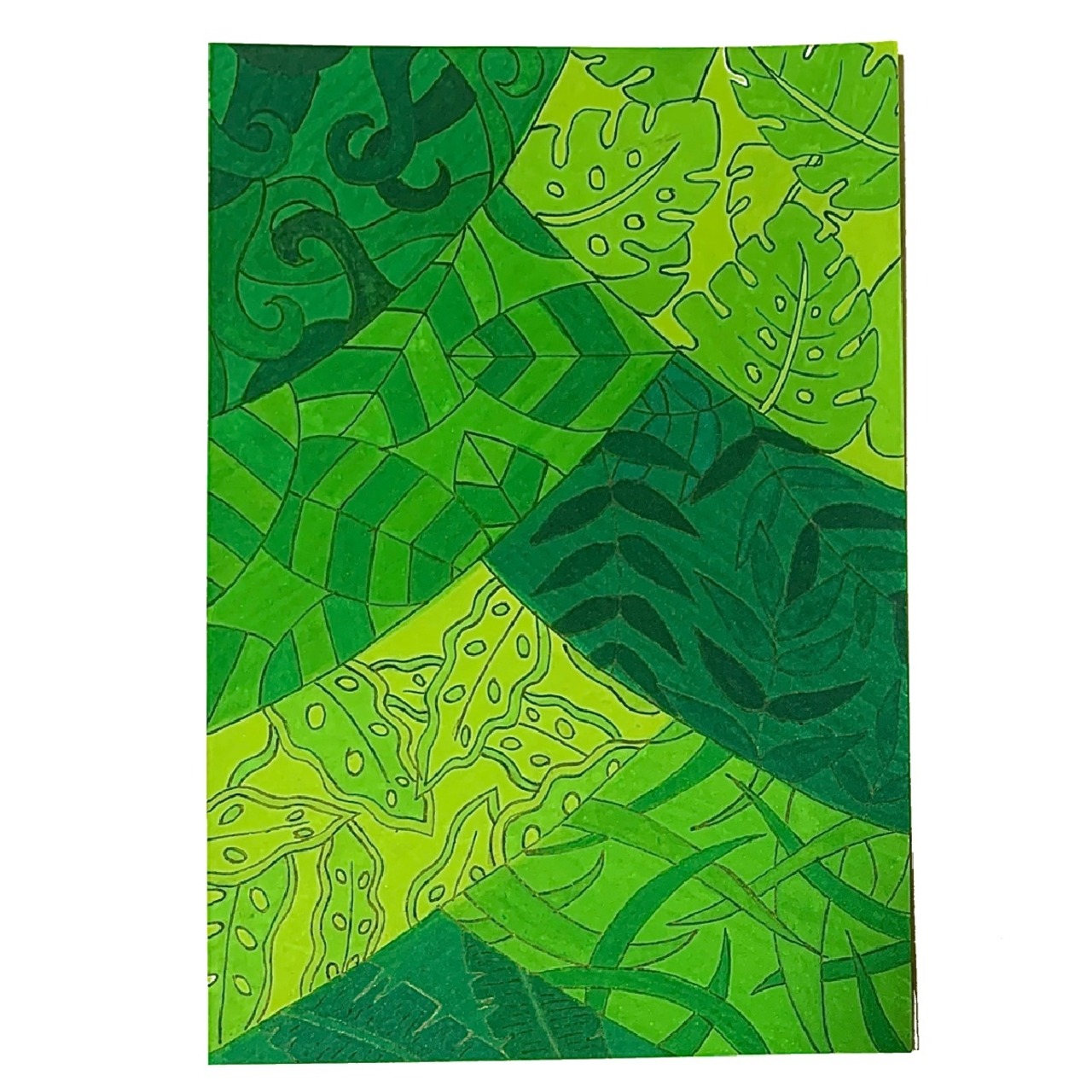 はがきサイズのカードに水彩ペンを塗り重ねその上に様々な柄を描いた一点作品です。