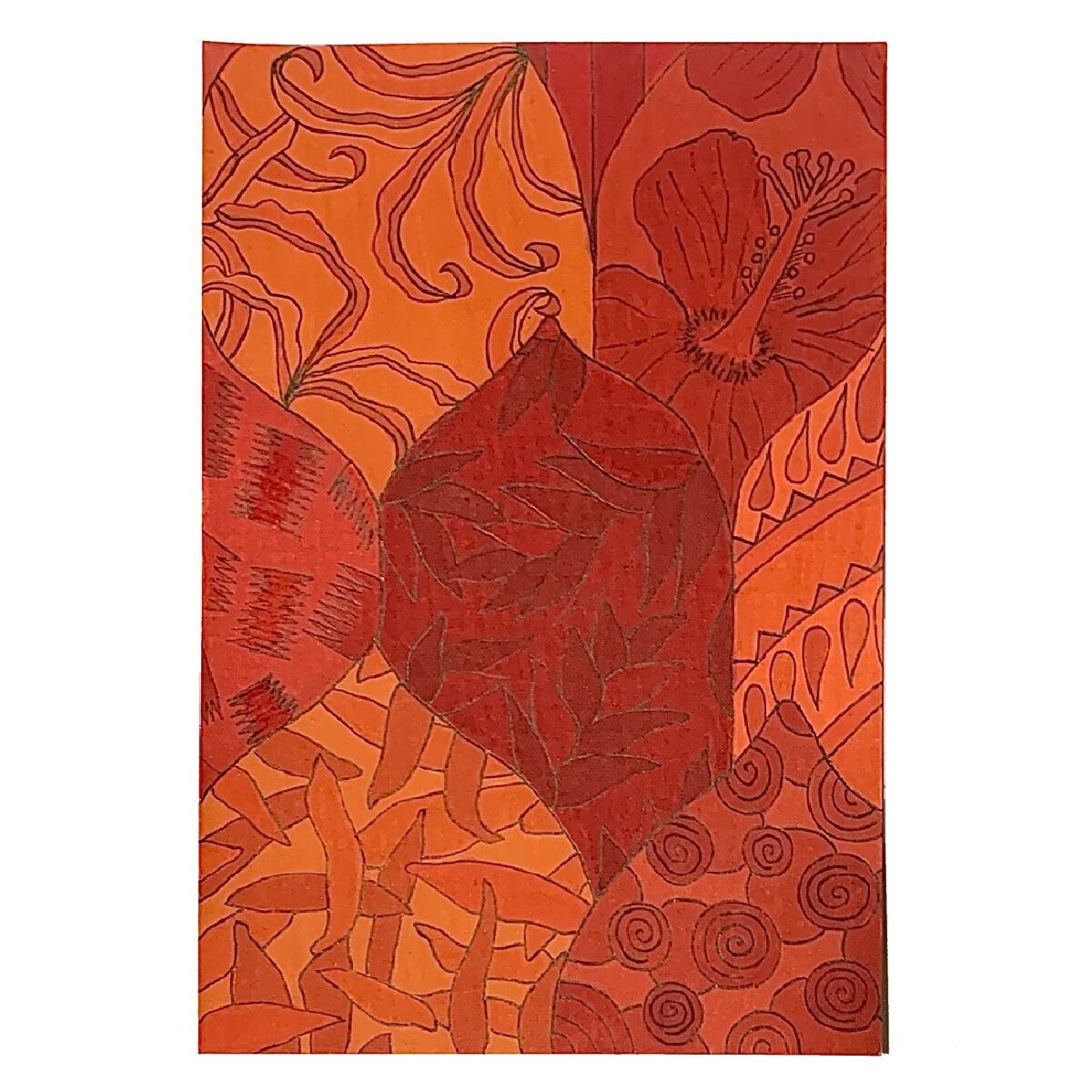 はがきサイズのカードに水彩ペンを塗り重ねその上に様々な柄を描いた一点作品です。